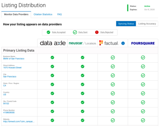 Listing Distribution submits your business information to the main data aggregators: Neustar/Localeze, Acxiom, Factual, and Data Axle.