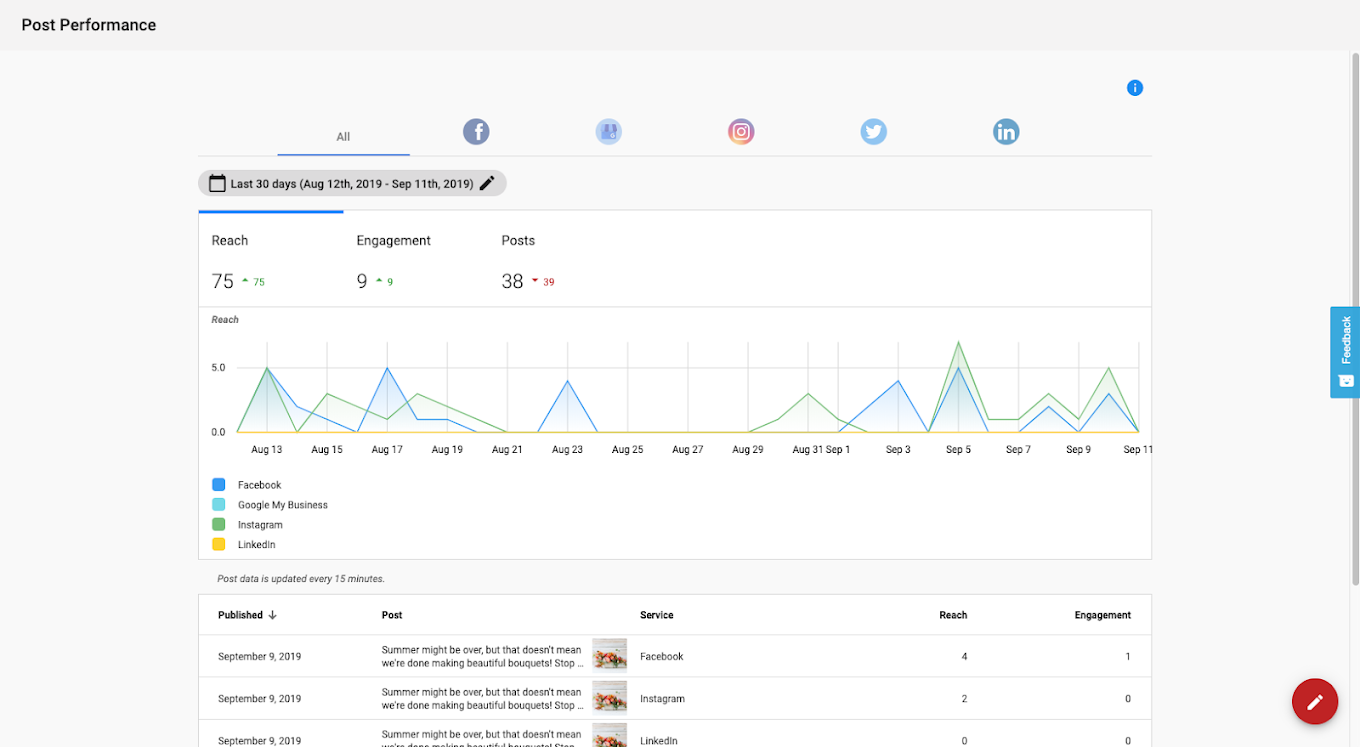 Allows you to post to all your social accounts including Facebook, Instagram, Google My Business, Twitter, and LinkedIn from one dashboard.